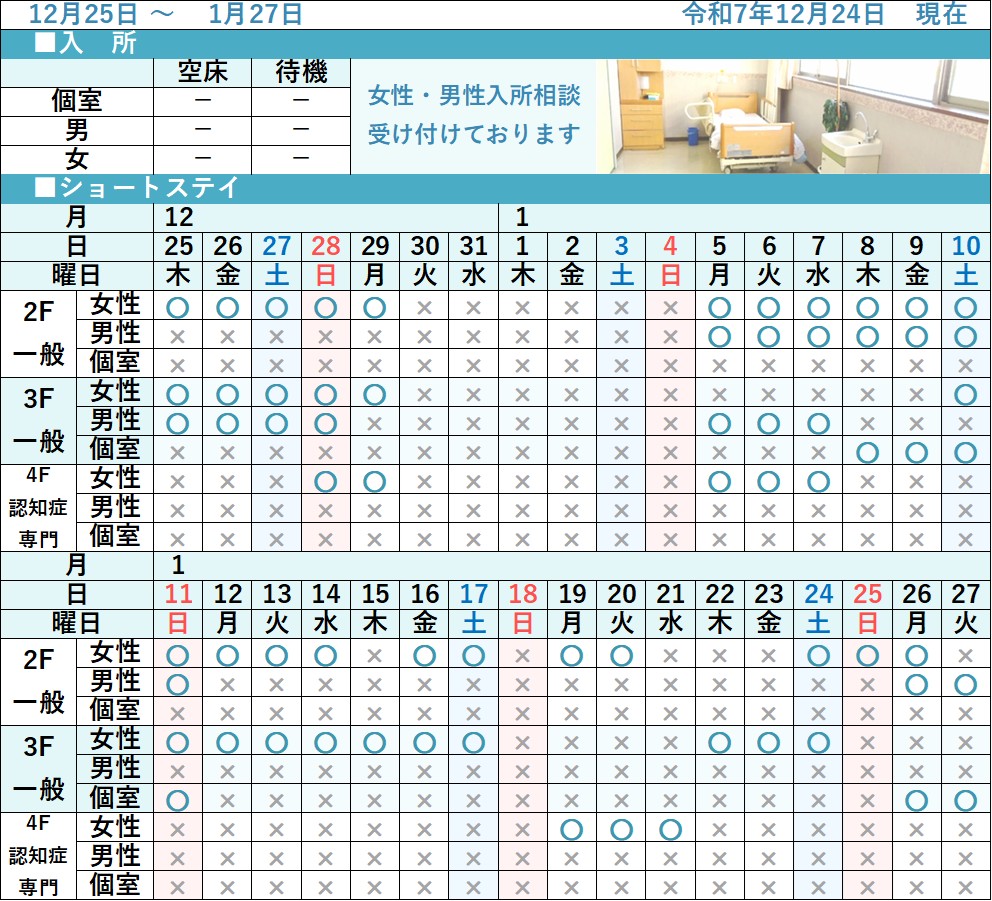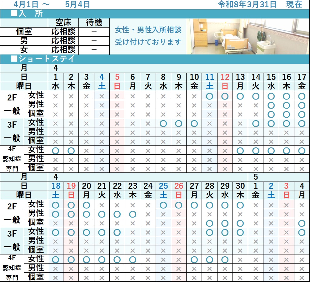 ※緊急のショートステイをご希望の方は随時お受けいたしますのでご一報ください。